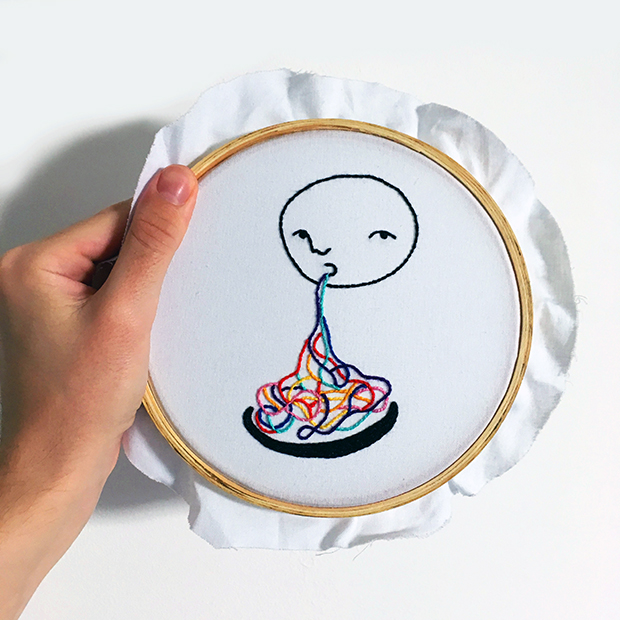 “O objetivo da criação dessa linha de bordados é externalizar os sentimentos e experiências vividas em relação a mim próprio e à sociedade”, comenta Affonso. Os aros de madeira têm 16 cm de diâmetro e são bordados em tecido de algodão na cor branca, que remete ao papel no qual as ilustrações foram originalmente criadas.